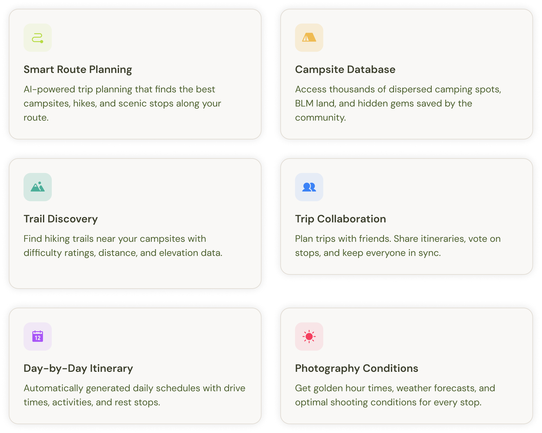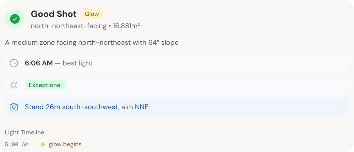 Rather than treating RoamsWild as a collection of tools, it become more of a set of decision-support systems. Each feature began with a specific question — all things that I have experienced while out on the road: How to predict better light, how to interpret weather for photography, how to surface potential campsites without relying solely on user reports.