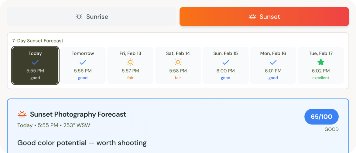 Standard weather apps show data; photographers need timing insight. This service evaluates cloud cover, cloud level, and wind during sunrise and sunset windows to determine whether conditions are promising. The result is a simplified signal with brief reasoning, helping users decide if the sky is likely to be clear, dramatic, or somewhere in between.