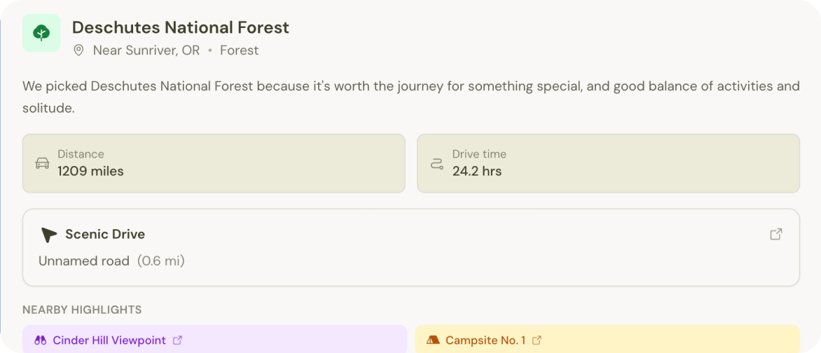 Designed and shipped a working trip planner and derived campsite discovery system in ~2 days